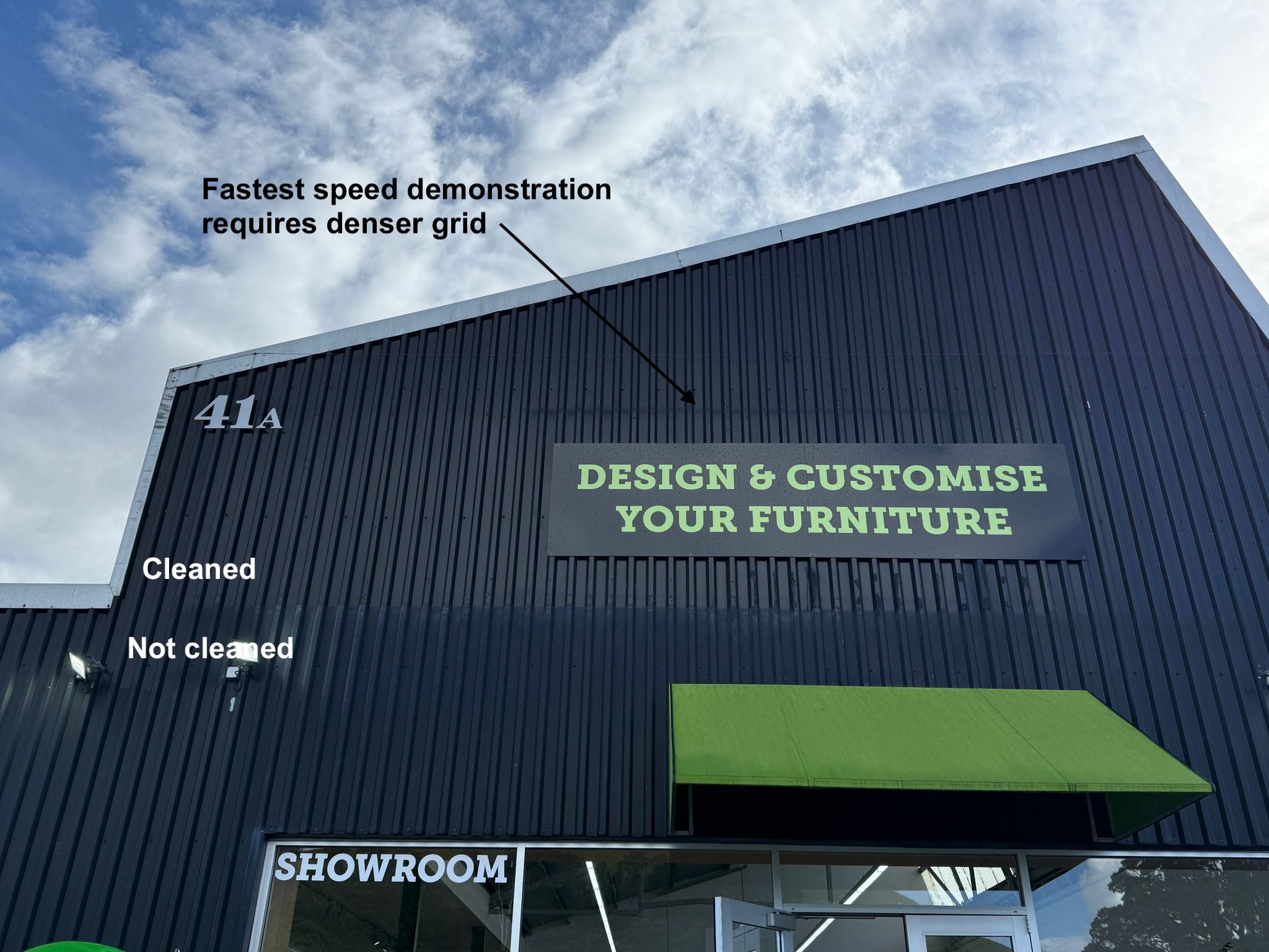 The facade was cleaned using a battery-powered pressure washing system, allowing for rapid deployment and efficient operation. The complete setup process took approximately 15 minutes, including equipment preparation and initial testing.